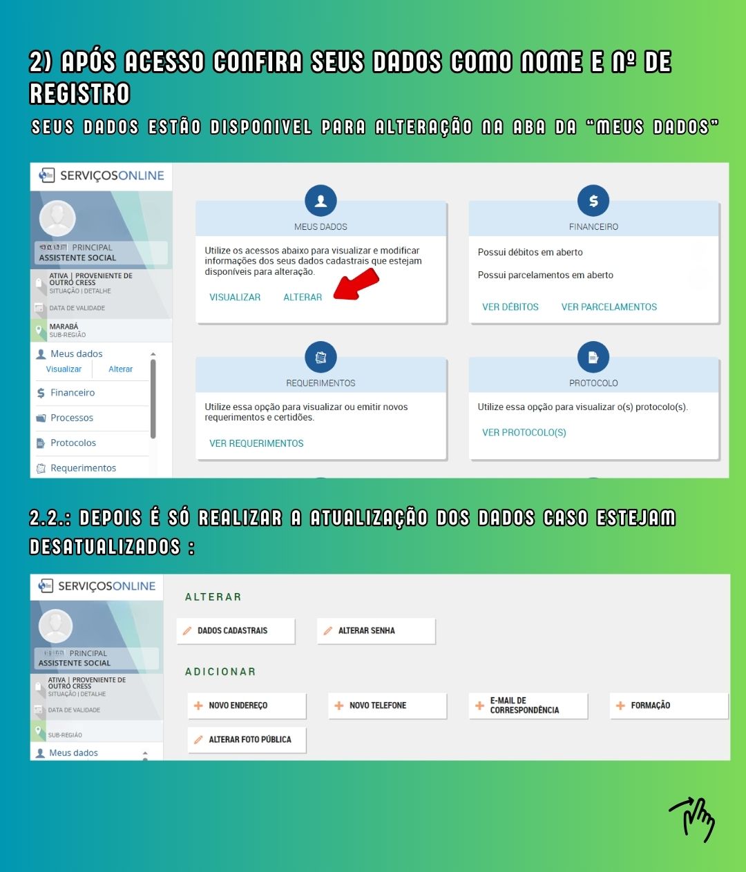 Atenção assistente sociais no Pará você sabia que tem acesso a todos seus dados junto ao Conselho? Ter endereço, e-mail e telefone correto é simples, rápido e, acima de tudo, um dever profissional — conforme o Art. 46 da Resolução CFESS nº 1.014/2022 e fortalecer a categoria.