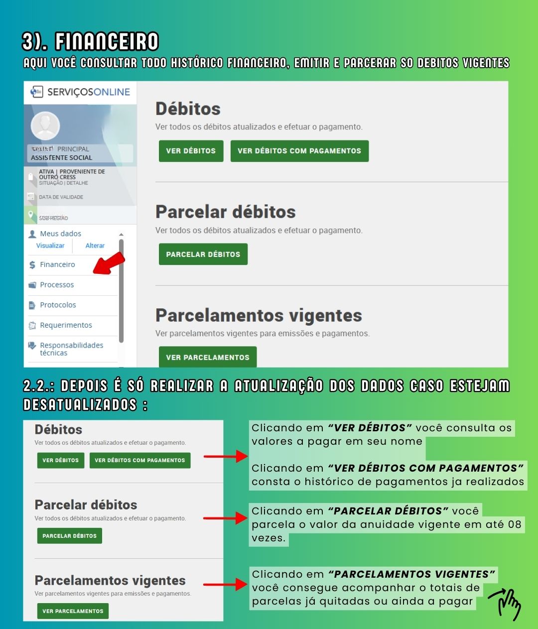 Na aba de financeiro: Consta a situação financeira junto ao conselho, disponível a anuidade vigente, parcelamentos e possiblidade de renegociação.