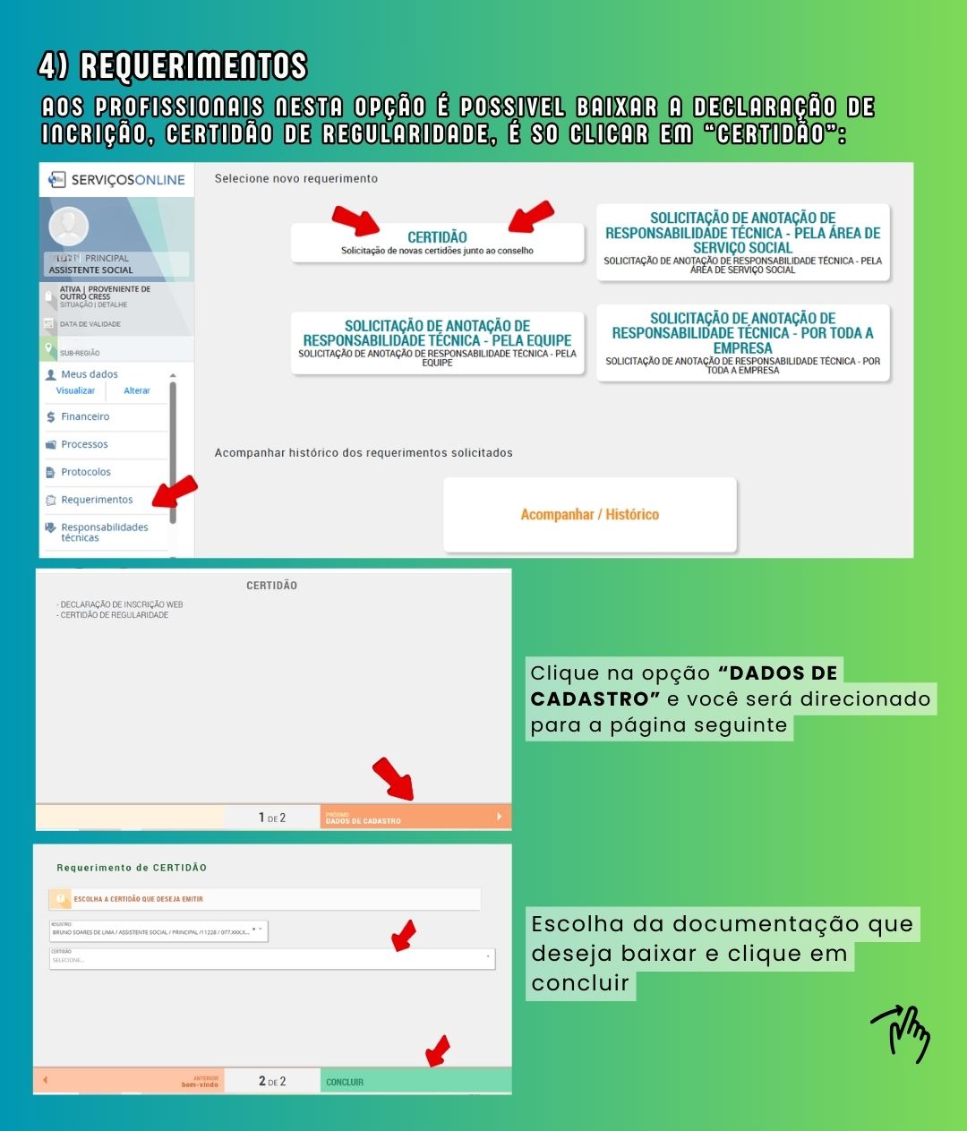 Nos dados pessoais: Consta dados relacionados ao profissional que foram apresentados durante o ato de inscrição junto ao CRESS-PA, em caso de qualquer alteração neles é preciso realizar a atualização.
