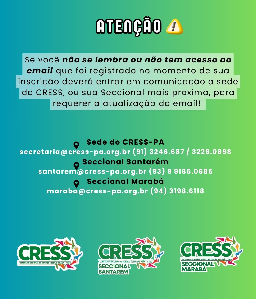 Em caso que não de não conseguir acessar o email que foi apresentando no ato da inscrição, entre em comunicação com o CRESS-PA ou Seccional de sua região para atualização.